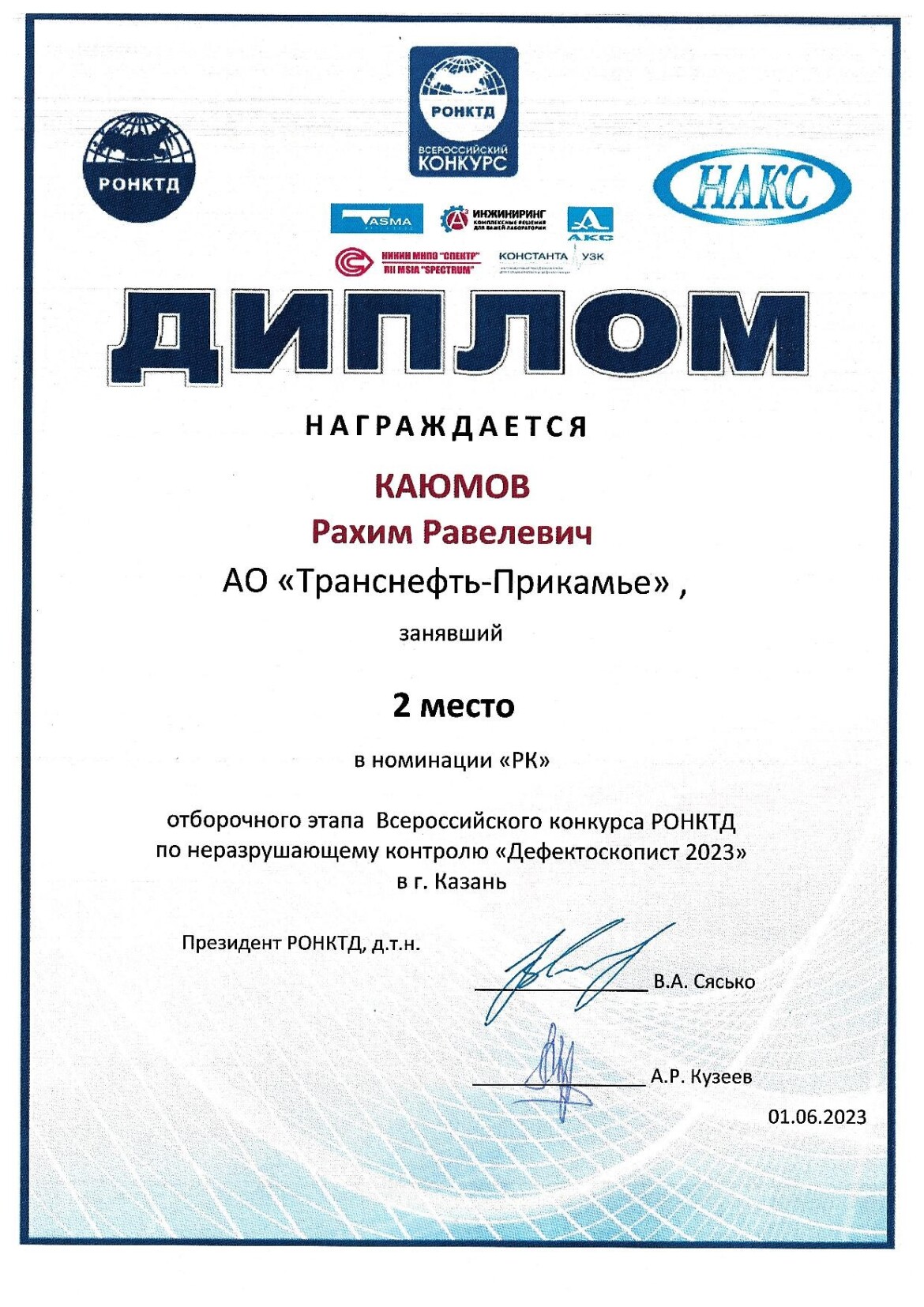 Обладателем второго места в номинации «Радиографический контроль» стал специалист лаборатории контроля качества Казанского районного нефтепроводного управления Рахим Каюмов. Успешным выступлением представитель АО «Транснефть — Прикамье» доказал свое высокое мастерство и профессионализм, а также желание достичь большего в профессиональной деятельности.