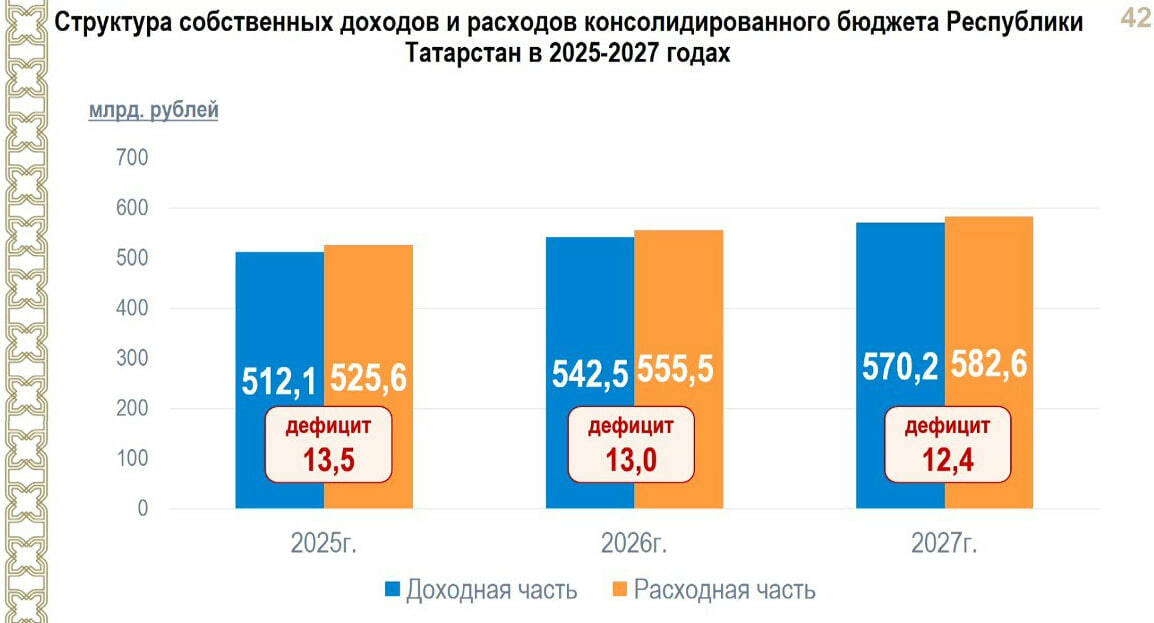 «На 2025 год параметры консолидированного бюджета прогнозируются такими: доходы в сумме 512,1 млрд рублей, расходы 525,6 млрд рублей, дефицит 13,5 млрд рублей», – сообщил Файзрахманов. Это означает, что расходы республики превышают доходы, что создает необходимость поиска дополнительных источников финансирования.