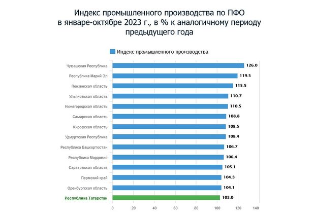 Татарстан по этому показателю совершенно неожиданно оказался в аутсайдерах. В пятерке лидеров по динамике индекса промышленного производства — Чувашская Республика (126%), Марий Эл (119,5%), Пензенская область (115,5%), Ульяновская область (110,7%) и Нижегородская область (110,5%).