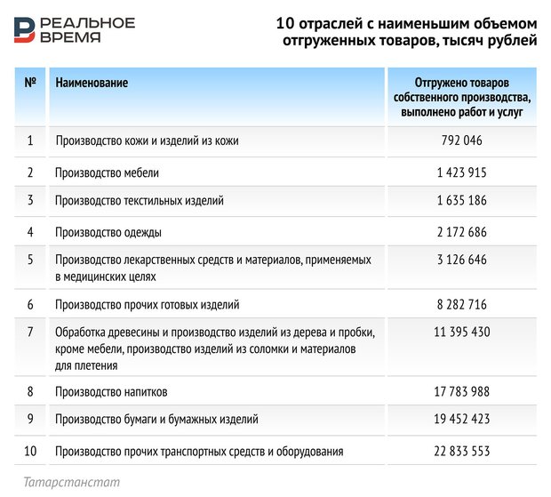 realnoevremya.ruВ топ-10 отраслей с наименьшим объемом отгруженных товаров в первом полугодии вошли производство кожи и изделий из кожи, производство мебели, производство текстильных изделий, производство одежды, производство лекарственных средств, производство напитков, бумаги и бумажных изделий, а также производство прочих транспортных средств и оборудования.