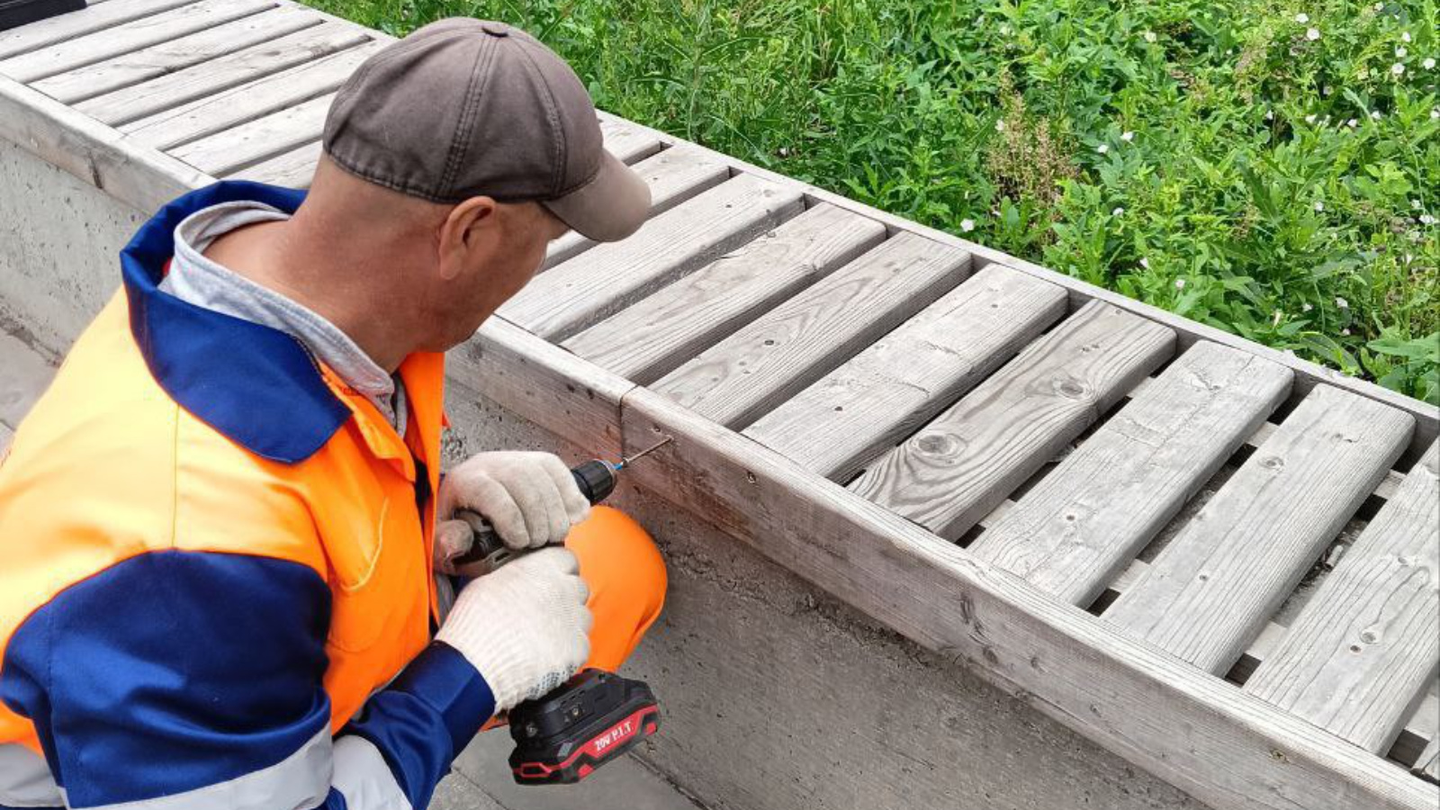 Сотрудники МУП «ГУАД» продолжают работу по благоустройству и содержанию городских территорий. На этот раз они провели ремонт скамеек, деревянного настила и очистили от надписей детские площадки на Бульваре Просвещения.
