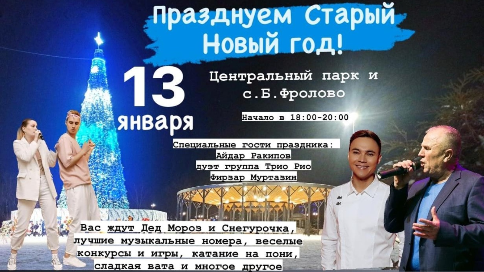 13 января, традиционный праздник Старый Новый год будем праздновать сразу на трёх площадках: Центральном, Молодежном и Сахарном парках города!