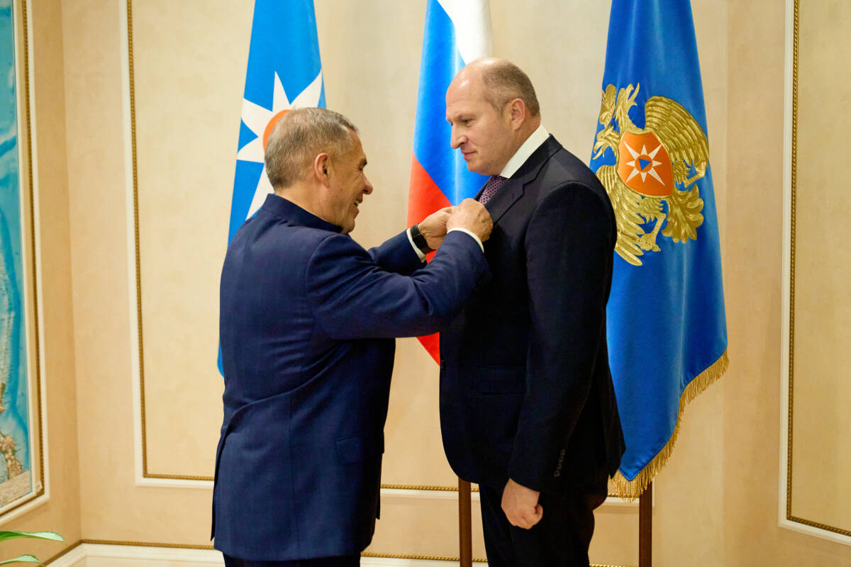 Кроме того, Раис Татарстана вручил главе МЧС России государственную награду РТ — орден «Дуслык». Этой наградой отмечен значительный вклад Александра Куренкова в обеспечение безопасности во время прошедшего в Казани шестнадцатого по счету саммита БРИКС.