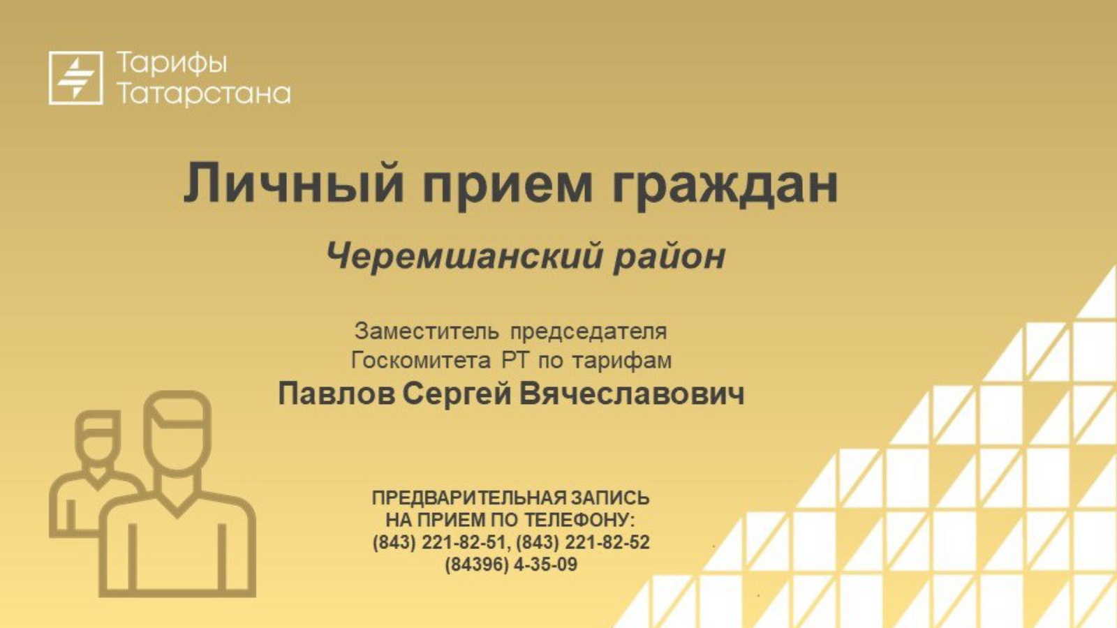 9 июля 2024 года заместитель председателя Госкомитета РТ по тарифам Сергей Павлов с рабочим визитом посетит Черемшанский муниципальный район, в ходе которого запланирован личный прием граждан в 10:00 ч. по адресу: