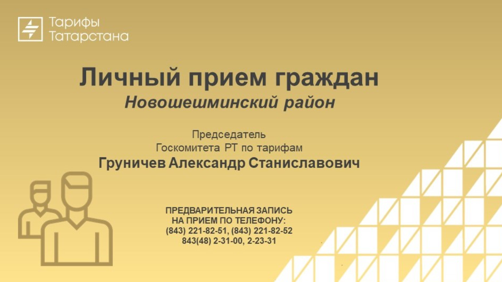 Записаться на прием можно в Исполнительном комитете Новошешминского муниципального района по телефонам: 843(48) 2-31-00, 2-23-31, а также в Госкомитете РТ по тарифам по телефонам: (843) 221-82-51, (843) 221-82-52