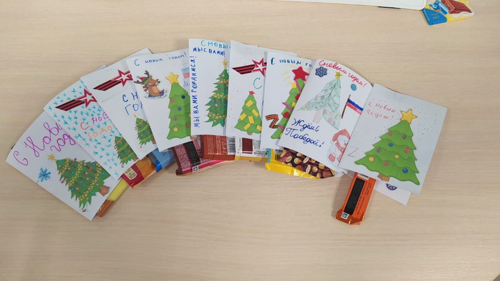 Ребята со всей душой и любовью делали своими руками новогодние открытки со словами поддержки и теплыми пожеланиями. Делились своими новогодними сладостями, вложив их в открытки.