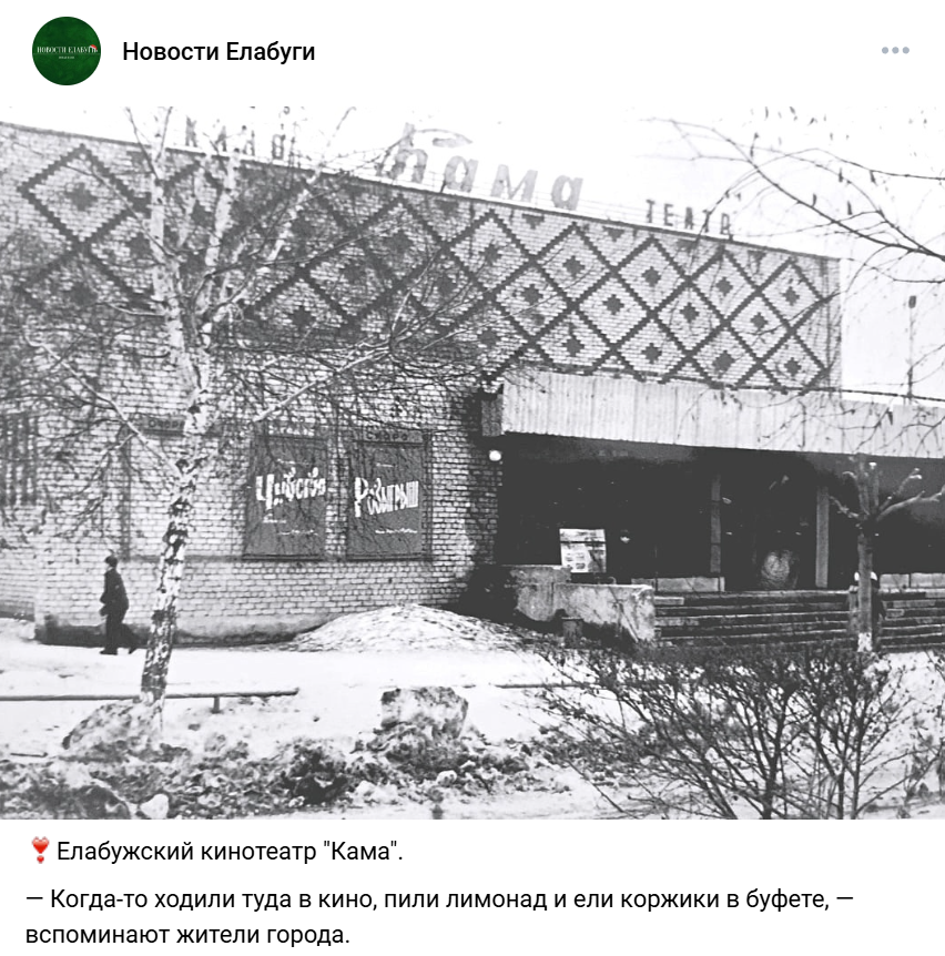 В наших социальных сетях продолжается популярная рубрика с ретро-фото Елабуги, и наши подписчики не устают делиться своими воспоминаниями. Одним из самых обсуждаемых постов стало изображение знаменитого кинотеатра "Кама", которое набрало 58 лайков.