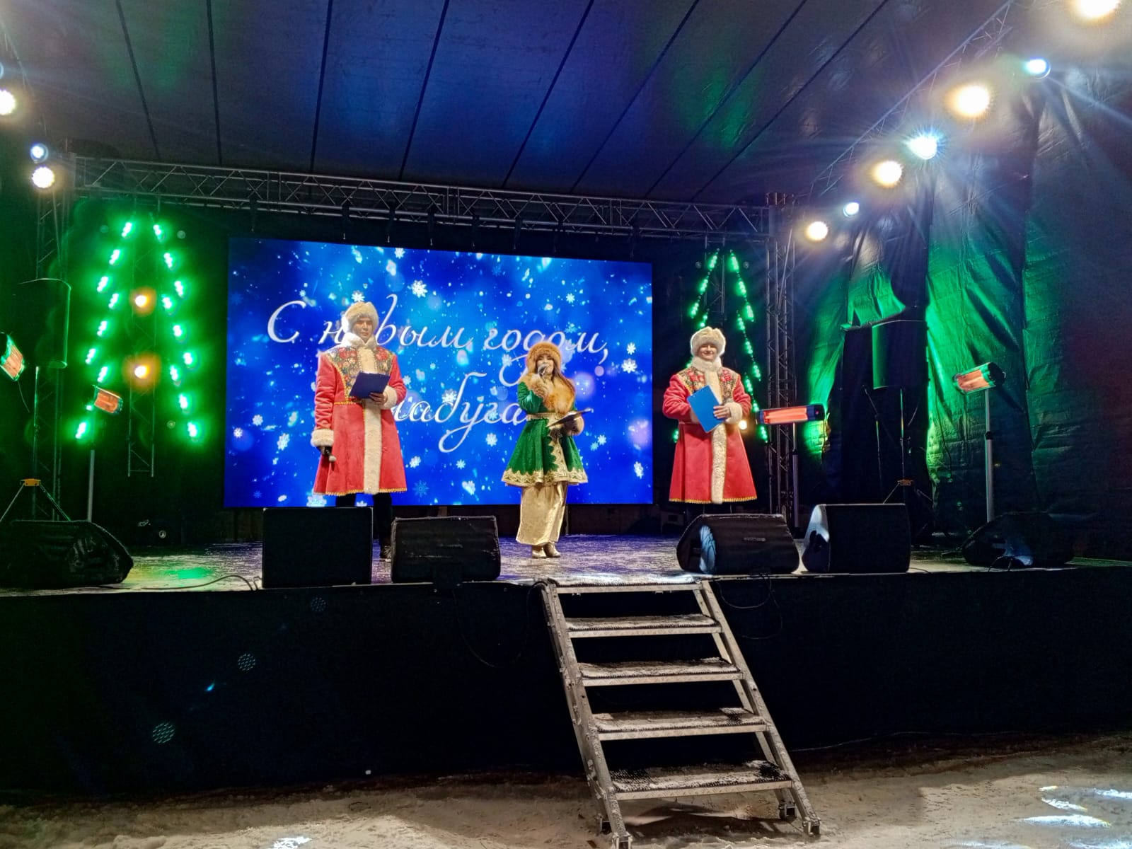 Программу продолжили вокальные номера елабужских артистов. Ярким моментом стало появление Деда Мороза и Снегурочки, которые подъехали к сцене на снегоходе.