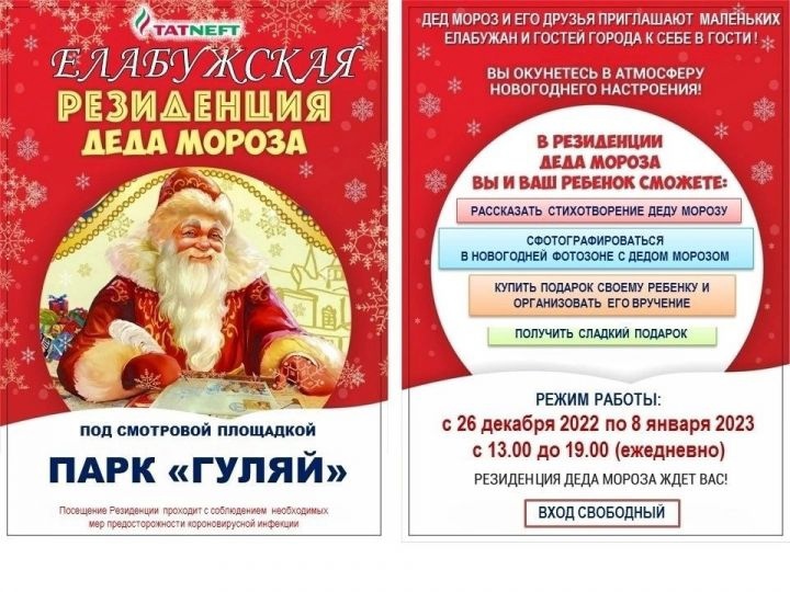В Елабуге с 13.00 до 19.00 каждый день работает резиденция Деда Мороза. Резиденция находится в Гуляй-парке в здании под смотровой площадкой.
