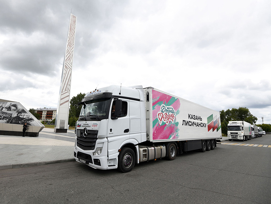 (Город Казань KZN.RU, 23 июня, Диана Жиленкова). Сегодня из Казани от стелы «Город трудовой доблести» отправили девятую партию гуманитарного груза весом 96 тонн в города Лисичанск и Рубежное. Жители пострадавших населенных пунктов получат продукты питания, строительные материалы и другие предметы первой необходимости. Отправку гуманитарной колонны из пяти фур от Северного вокзала проинспектировал Мэр столицы РТ Ильсур Метшин.«От имени жителей Казани очередной гуманитарный поезд мы отправляем в Лисичанск и Рубежное. В пяти фурах множество различных строительных материалов. Если первые гуманитарные поезда состояли в основном из продуктов питания, то теперь все больше отправляем стройматериалы и все, что нужно для восстановления хозяйства. В пяти фурах почти 100 тонн груза, а всего с начала сбора гуманитарной помощи казанцы собрали и отправили уже более 1 тыс. тонн груза Лисичанску, а теперь уже и Рубежному», – подчеркнул глава города.