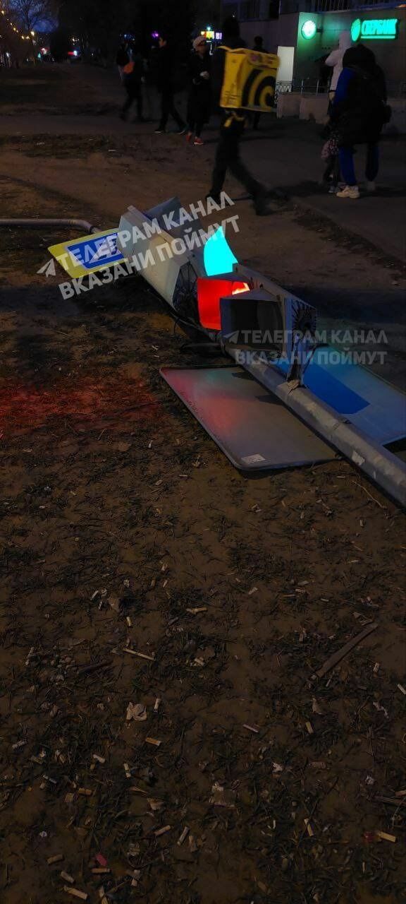 Из-за сильного ветра в Казани упал светофор с дорожным знаком