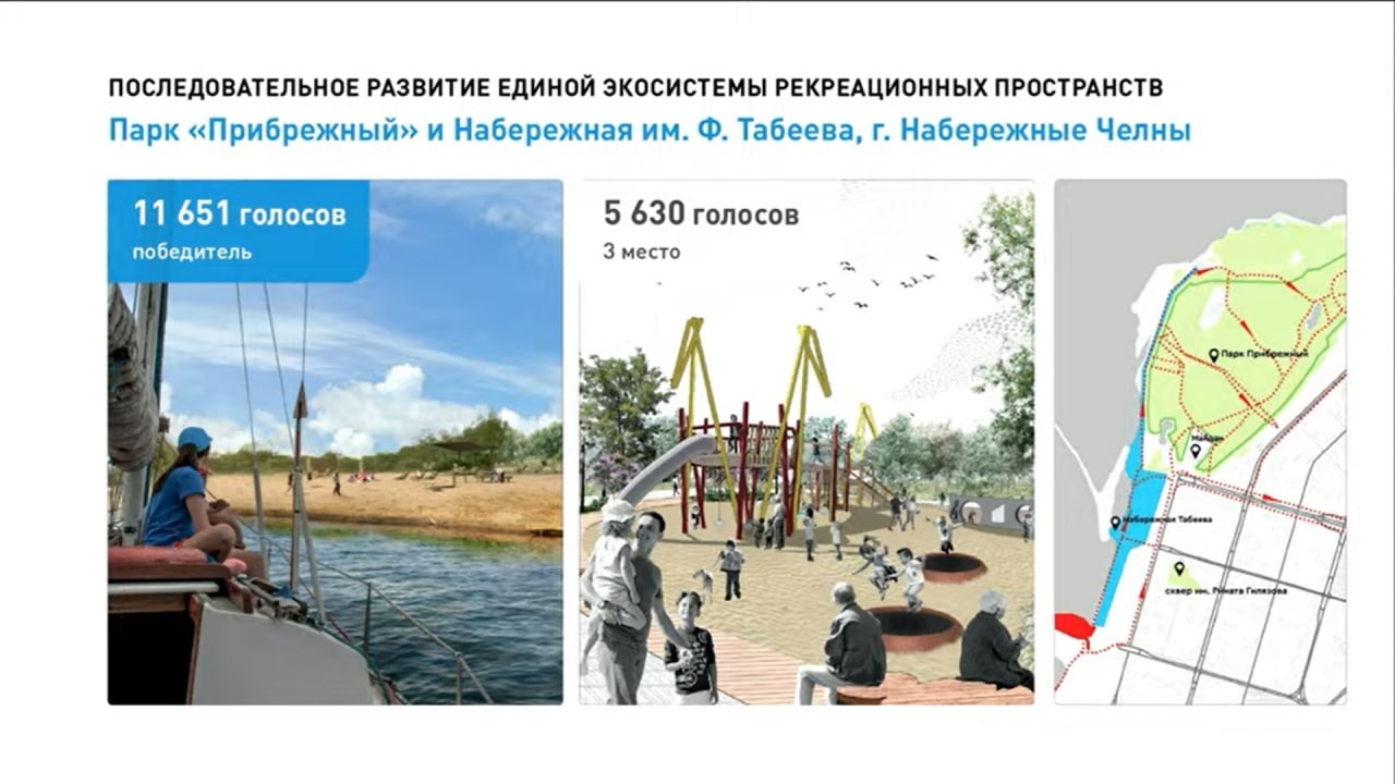 В Набережных Челнах наибольшее количество голосов отдали на парк «Прибрежный и набережную имени Табеева, фактически объединенные в единую экосистему. По словам Зиннатуллиной, здесь появится полноценный связный каркас, но, возможно, не за один и даже не за три года.
