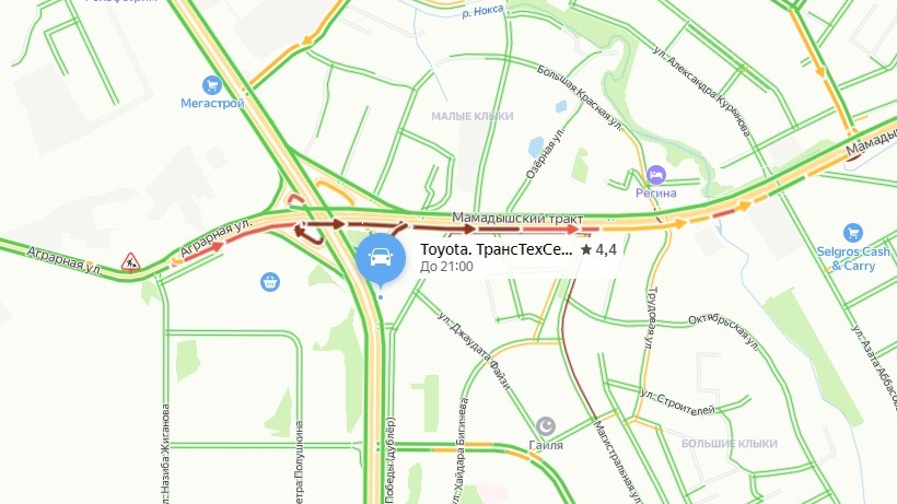 Сейчас движение автомобилей затруднено начиная с улицы Аграрной практически до пересечения Мамадышского тракта и улицы Рахлина. Сложности с проездом наблюдаются и на кольце у Проспекта Победы.