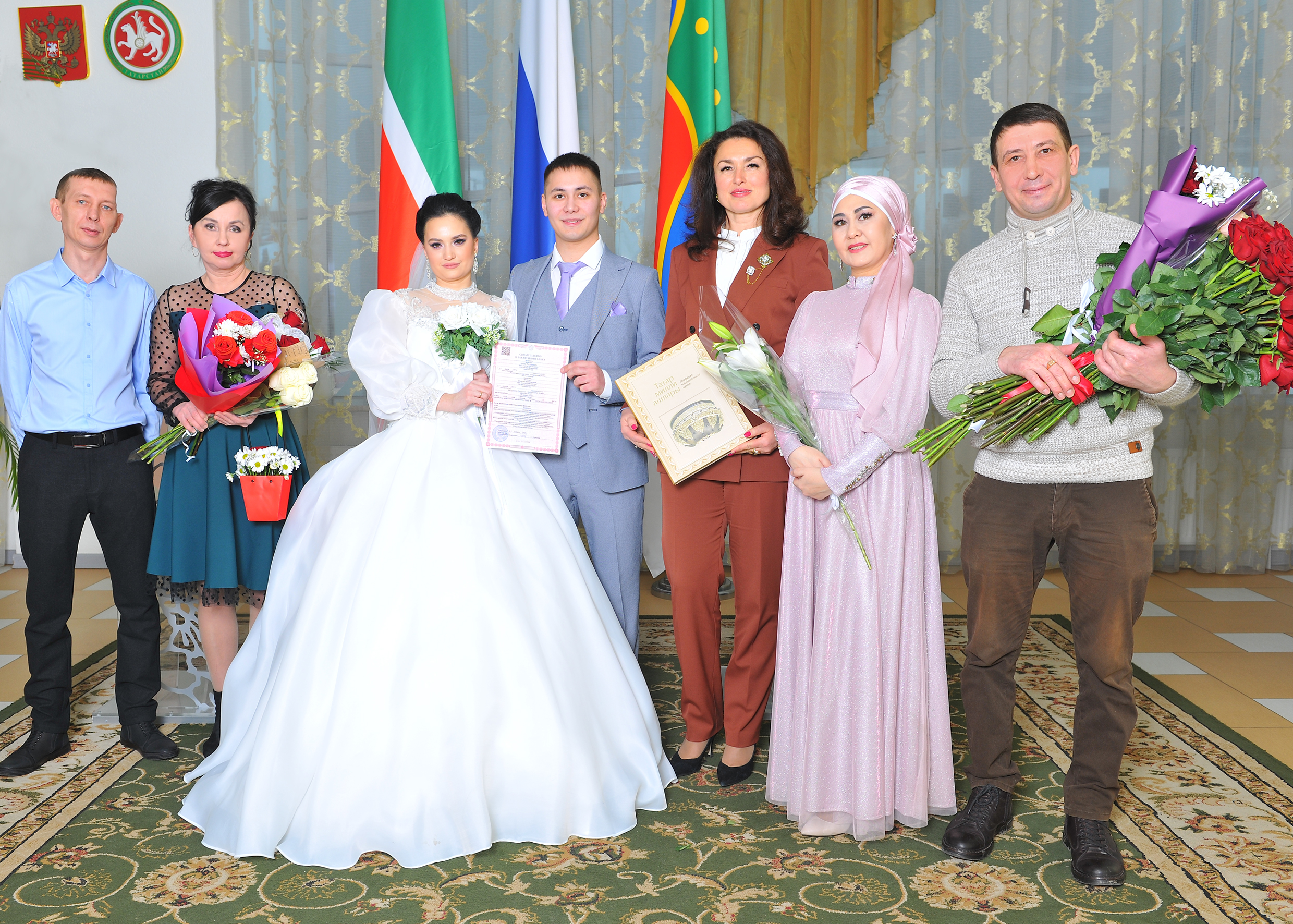 Во Дворце торжеств г. Набережные Челны Новиковы Дамир и Милена стали 100-ой парой 2023 г. Начальник Управления ЗАГС Равиля Зарипова поздравила молодую супружескую пару и торжественно вручила государственный документ - свидетельство о заключении брака, поздравительную открытку от имени мэра города Набережные Челны и памятный подарок.