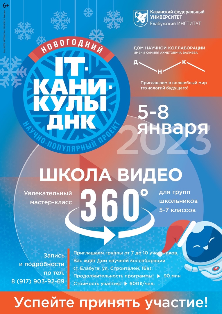 С 5 по 8 января в Доме научной коллаборции Елабужского института КФУ пройдёт познавательная программа. Для юных елабужан приготовлены сладкие призы от Деда Мороза, цифровые баттлы и trend-party, а также тематическая фотозона.