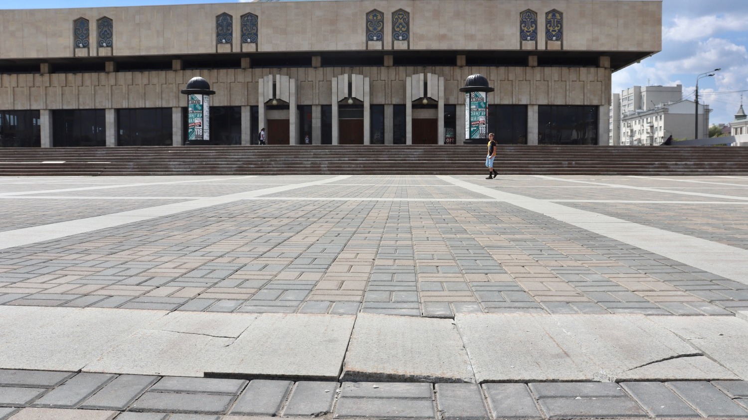 Одна из главных проблем территории — покрытие и лестницы. Ступени на подъеме к театру и плитка на площади буквально «плывут» под ногами. Об этом, к слову, совсем недавно заявлял преподаватель Казанского федерального университета Айрат Бик-Булатов . Он отметил, что в трещинах уличного покрытия начала расти трава.