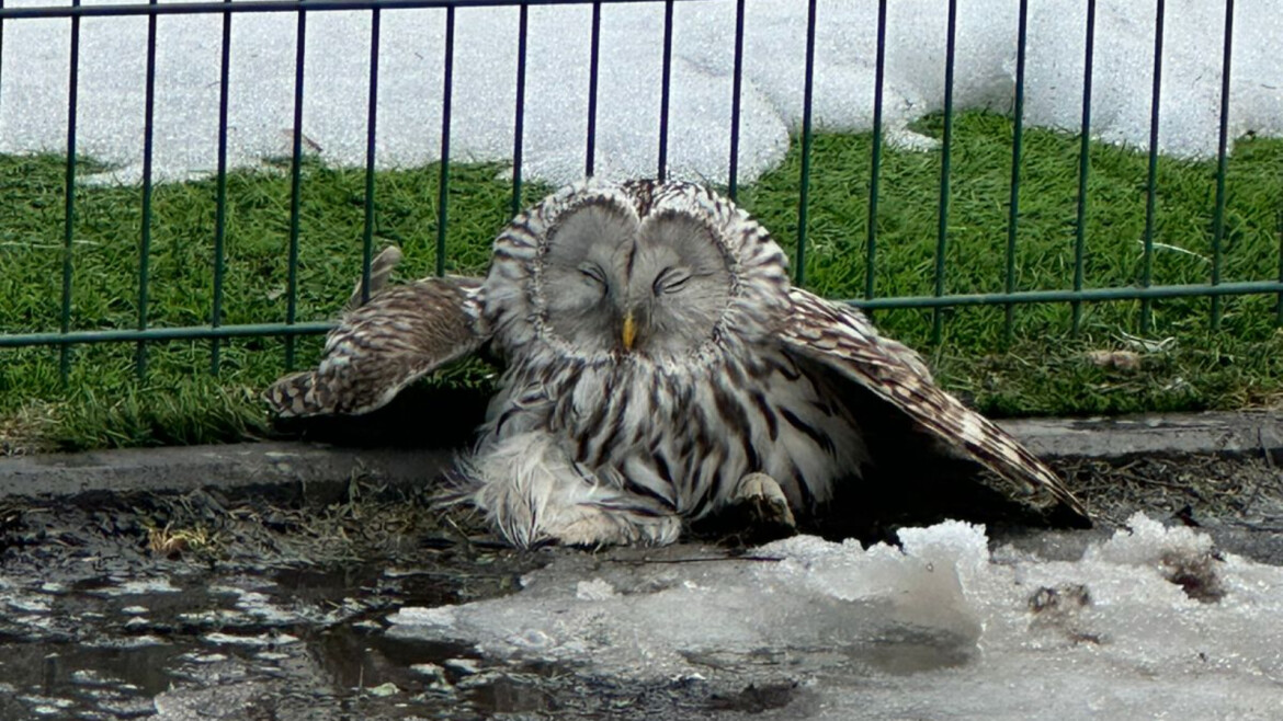 Огромная серая сова запуталась крыльями в ограждении полилингвального комплекса «Адымнар» в Казани.