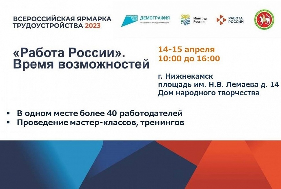 В Нижнекамске 14 и 15 апреля пройдёт Всероссийская ярмарка трудоустройства «Работа России. Время Возможностей».