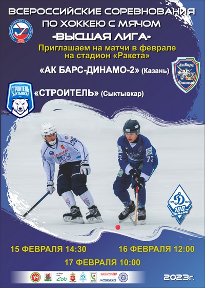 15, 16 и 17 февраля «Ак Барс-Динамо-2» проведет на домашнем стадионе три матча со «Строителем» из Сыктывкара, в рамках Всероссийских соревнований «Высшая лига».