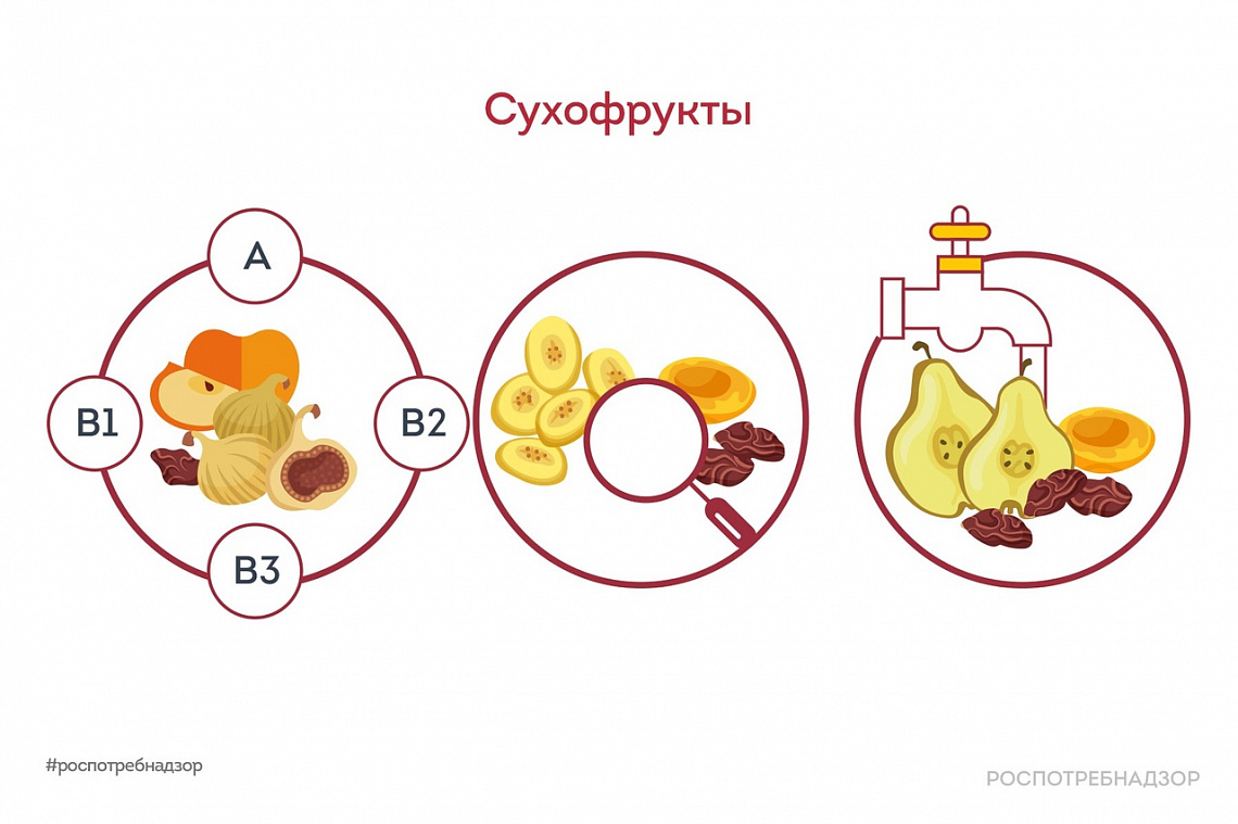 Сухофрукты – высушенные фрукты или ягоды с остаточной влажностью около 20%. Они богаты витаминами (A, B1, B2, B3, B5, B6) и минеральными элементами (железо, кальций, магний, фосфор, калий, натрий). У них длительный срок хранения и они не требуют содержания в холодном месте. Однако во время сушки сухофрукты теряют большую часть витамина C.