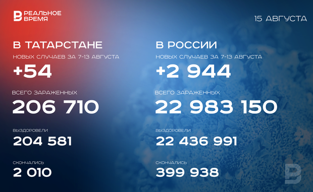 Напомним, за предыдущие семь дней — с 31 июля по 6 августа — в республике зарегистрировали 60 случаев COVID-19. Три недели подряд — с 10 по 16 июля , с 17 по 23 июля , с 24 по 30 июля — в Татарстане выявляли по 59 зараженных. С 3 по 9 июля зафиксировали 63 случая заражения.