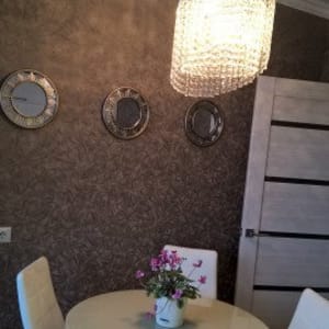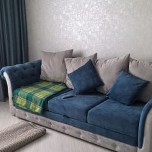 B квартире находится два спальных места - это двуспальная кровать и мягкий диван. На кухне имеется все необходимое для приготовления пищи: электрический чайник, микроволновая печь, холодильник.